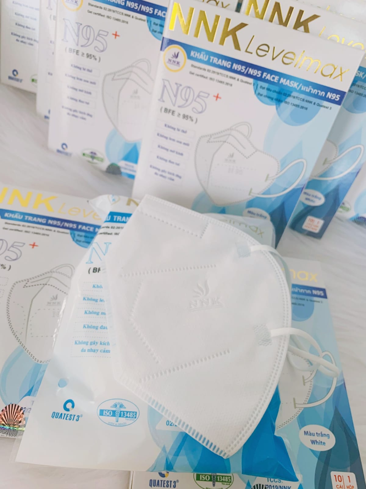 NNK N95+ LEVELMAX ISO Premium Medical Mask.ISO Certified.ISO 9001 : 2015.ISO 13485 : 2016.Standard VN 8389 - 1 : 2010.CE Certified.BFE>95%Quatest 310 embossed mask per box.Expiry Date: 2026 onwards.