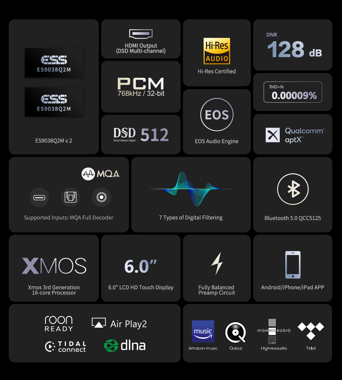 > Support DSD512 Native, PCM768KHz@32Bit, MQA full decoding.