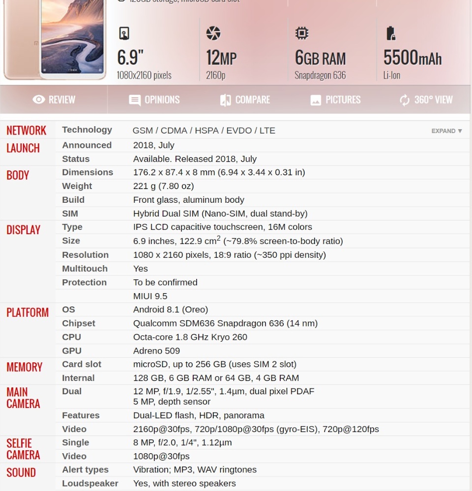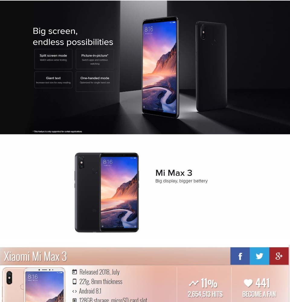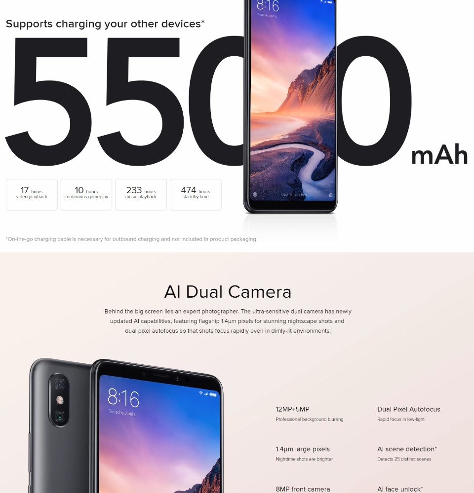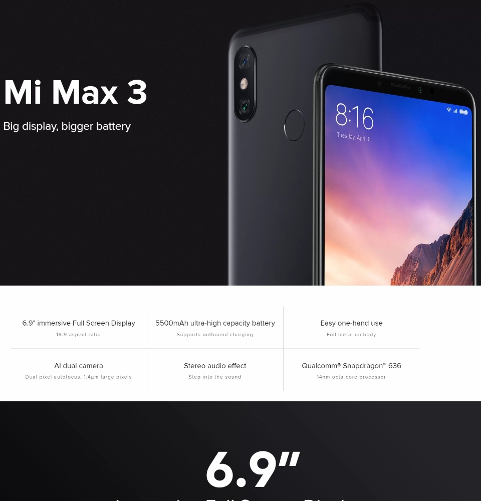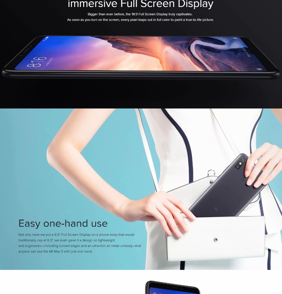 小米Max 3//64GB ROM 4GB RAM/6.9英寸/5500mAh电池/AI面部解锁/出口套装(SG保修)